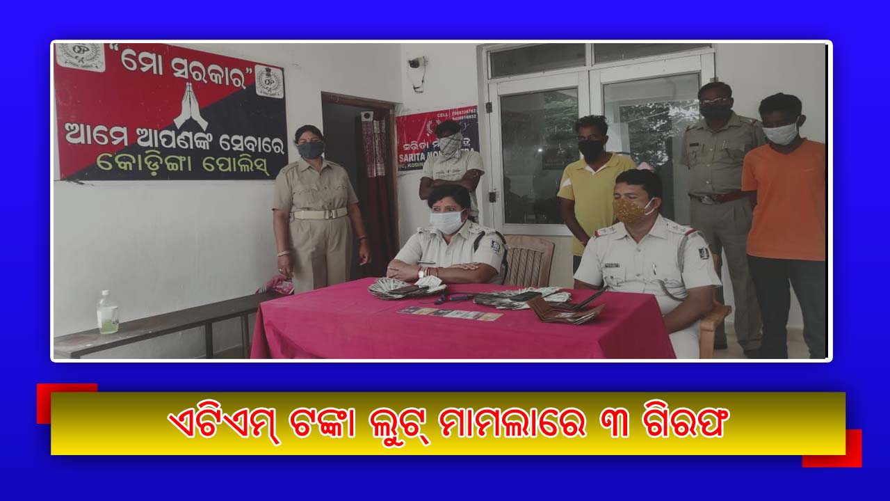 ନବରଙ୍ଗପୁର,(ବି.ବି.ନୁ୍ୟଜ୍): ଏଟିଏମ୍ରୁ ଲକ୍ଷାଧିକ ଟଙ୍କା ଲୁଟ୍ ମାମଲାରେ ନବରଙ୍ଗପୁର ଜିଲ୍ଲା କୋଡ଼ିଙ୍ଗା ପୁଲିସ୍ ଆଜି ୩ଜଣଙ୍କୁ ଗିରଫ କରି କୋର୍ଟ ଚାଲାଣ କରିଛି । ଗିରଫମାନେ ହେଲେ ବି. ସେମଳା ଗାଁର ଜୟଦାସ ହିଆଲ, ରମେଶ ହରିଜନ ଓ ମସା ହରିଜନ ।