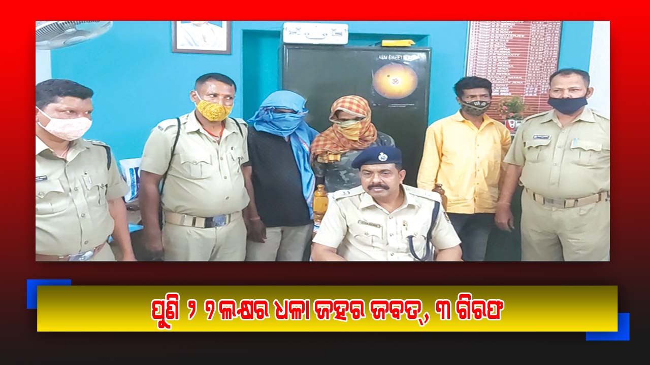 ଅତିରିକ୍ତ ଏସ୍ପି ଶ୍ରୀ ପଣ୍ଡାଙ୍କ ସୂଚନା ଅନୁଯାୟୀ ଭଦ୍ରକରୁ ଧୂଷୁରୀ ଅଞ୍ଚଳକୁ ବ୍ରାଉନସୁଗର ଚାଲାଣ ହେଉଥିବା ନେଇ ଧୁଷୁରୀ ଥାନାଧିକାରୀ ପି.କେ.ସିଂଙ୍କ ନିକଟରେ ସୂଚନା ପହଞ୍ଚିଥିଲା । ଶ୍ରୀ ସିଂଙ୍କ ନିଦେ୍ର୍ଧଶରେ ଏକ ପୁଲିସ ଟିମ ଅସୁରାଳି ବଜାର ନିକଟସ୍ଥ ଉଚ୍ଚପଆ ନିକଟରେ ଜଗି ବସିଥିଲେ । ଗତକାଲି ଅପରାହ୍ନ ପ୍ରାୟ ଗୋଟାଏ ବେଳେ, ୩ଜଣ ସଂଦିଗ୍ଧ ଯୁବକ ଏକ ସ୍କୁଟି(ଓଡି ୨୨ଆର-୬୨୫୩)ରେ ଯାଉଥିବା ବେଳେ ପୁଲିସ ସେମାନଙ୍କୁ ଅଟକାଇଥିଲା । କିନ୍ତୁ ସେମାନେ ପଳାଇ ଯିବାକୁ ଉଦ୍ୟମ କରିବାରୁ ପୁଲିସ ସେମାନଙ୍କୁ ଗୋଡ଼ାଇ ଅସୁରାଳୀ ବିଦୁ୍ୟତ୍ ଷ୍ଟ୍ରକଚର ନିକଟରେ କାବୁ କରିଥିଲା । ମଣିଭଦ୍ର ପ୍ୟାଣ୍ଟ ପକେଟରୁ ପୁଲିସ ୨୭୦ ଗ୍ରାମର ବ୍ରାଉନ ସୁଗର ଜବତ୍ କରିଥିବା ବେଳେ, ସମସ୍ତ ୩ ଅଭିଯୁକ୍ତଙ୍କ ନିକଟରୁ ଉପରୋକ୍ତ ଅନ୍ୟସାମଗ୍ରୀ ଜବତ୍ କରିଥିଲା । ଆଜି ତିନି ଅଭିଯୁକ୍ତଙ୍କୁ କୋର୍ଟ ଚାଲାଣ କରାଯାଇଛି । ଭଅ୍ରକ ଜିଲ୍ଲାରୁ ଧଳା ଜହର କାରବାରର ମୂଳପୋଛ ପାଇଁ ପୁଲିସ ଉଦ୍ୟମ ଜାରି ରଖିବ ବୋଲି ଶ୍ରୀ ପଣ୍ଡା ସୂଚନା େଅଇଛନ୍ତି ।