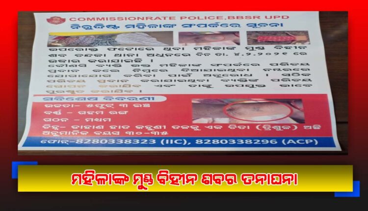 ଭୁବନେଶ୍ୱର,(ବି.ବି.ବୁ୍ୟରୋ): ଅନ୍ଧାରୁଆରୁ ମହିଳାଙ୍କ ମୁଣ୍ଡ ବିହୀନ ମୃତଦେହ ମିଳିବା ଘଟଣାରେ ଏବେ ବି ଅନ୍ଧାରରେ ବାଡିÿ ବୁଲାଉଛି କମିସନରେଟ୍ ପୁଲିସ । ଆଜି ମହିଳାଙ୍କ ପରିଚୟ ଖୋଜିବାକୁ ଗୁରୁତ୍ୱ ଦେଇଛି । ସହରର ଚାରିଆଡେ଼ ନିଖୋଜ ସମ୍ପର୍କିତ ପୋଷ୍ଟର ଲଗାଇଛି । ଏହାବାଦ୍ ମହିଳାଙ୍କ ସମ୍ପର୍କରେ ଖବରଦାତାଙ୍କୁ ୫୦ ହଜାର ଟଙ୍କା ପୁରସ୍କାର ଦେବାକୁ ଘୋଷଣା କରିଛି ।