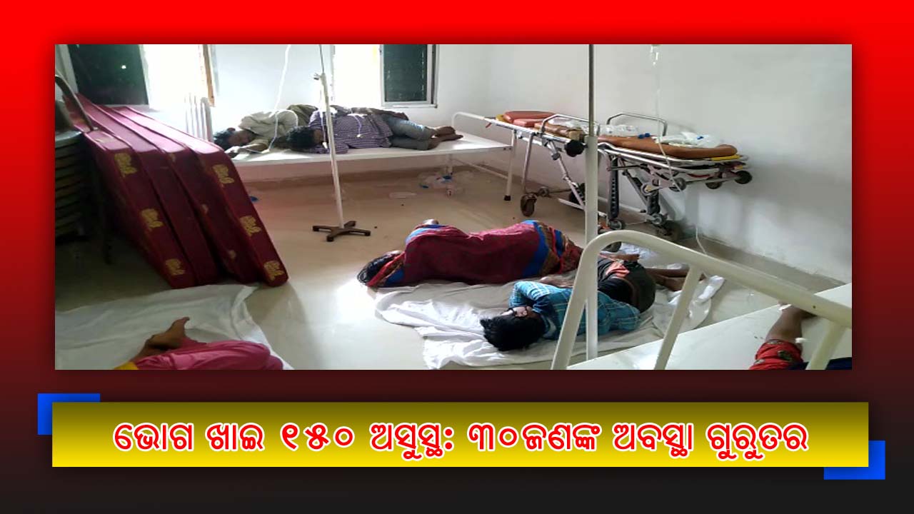 ପଟ୍ଟାମୁଣ୍ଡାଇ : ପୂଜା ଭୋଗ ଖାଇ ୧୫୦ ଅସୁସ୍ଥ । କେନ୍ଦ୍ରାପଡା ଜିଲ୍ଲା ରାଜନଗର କୃଷ୍ଣନଗର ପଞ୍ଚାୟତ ପିନ୍ଛାପାଟିଆ ଗାଁରେ ଘଟିଛି ଏଭଳି ଘଟଣା । ଅସୁସ୍ଥଙ୍କ ମଧ୍ୟରୁ ୩୦ ଜଣ ଗୁରୁତର ହୋଇଛନ୍ତି । ସେମାନଙ୍କୁ ରାଜନଗର ମେଡିକାଲରେ ଭର୍ତ୍ତି କରାଯାଇଛି । ମେଡିକାଲ ଟିମ୍ ସହାୟତାରେ ଅନ୍ୟମାନଙ୍କୁ ଗାଁ ସ୍କୁଲରେ ଚିକିତ୍ସା କରାଯାଉଛି । ରବିବାର ଗାଁରେ ଦୁର୍ଗାପୂଜା ଭୋଗ ଖାଇ ଅସୁସ୍ଥ ହୋଇଥିବା ଜଣାଯାଇଛି ।