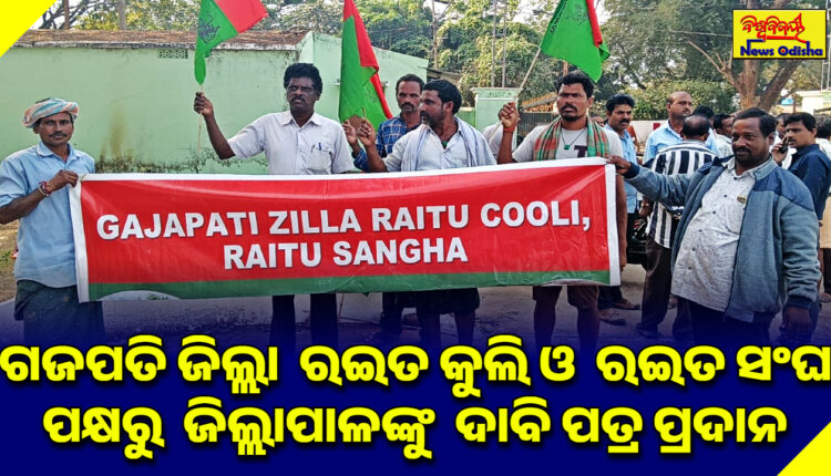 { ଗଜପତିରୁ ରେଣୁବାଳା ବେହେରାଙ୍କ ରିପୋର୍ଟ } : ଗଜପତି ଜିଲ୍ଲା ରଇତ କୁଲି ଓ ରଇତ ସଂଘ ପକ୍ଷ ରୁ ଜିଲ୍ଲା ପାଳ ଙ୍କୁ ଏକ ଦାବି ପତ୍ର ପ୍ରଦାନ କରାଯାଇଛି ଦାବି ଗୁଡ଼ିକ ହେଲା ଭାଗ ଚାଷୀଙ୍କୁ ଅନଲାଇନ ରେ ସୁବିଧା ସୁଜଗ ଯୋଗାଇଦେବା , ମହାତ୍ମା ଗାନ୍ଧୀ ନିଶ୍ଚିତ କର୍ମ ନିଯୁକ୍ତ ଯୋଜନା ରେ ସହେ ଦିନ ପରିବର୍ତ୍ତେ ଦୁଇଶ ଦିନ କାମ ଯୋଗାଇ ଦେବା,ଫସଲ କ୍ଷୟ କ୍ଷତି ଏକର ପିଛା ତିରିଶି ହଜାର ପ୍ରଦାନ କରିବା, ମଣ୍ଡି ରୁ ଯଥା ଶିଘ୍ର ଚାଷୀ ଙ୍କ ଧା ନ କ୍ର ୟ କରିବା, ଚାଷୀଙ୍କ ସକାଶେ ଗୋଦାମ ଗୃହ ନିର୍ମାଣ କରିବା ସକାଶେ ଦାବି କରାଯାଇଛି ।